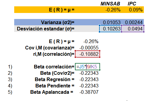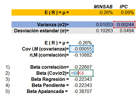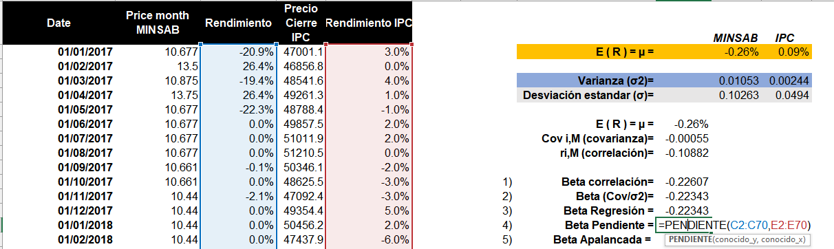 Existen 5 formas distintas para calcular la Beta de un activo financiero las cuales veremos a continuación, sin embargo todas deben de dar resultados iguales excepto uno. (todos los cálculos serán en Excel)