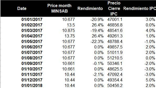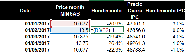 Una vez tengamos los precios de la emisora y del índice donde cotiza los ponemos en un nuevo excel.