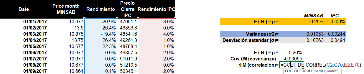 Después calcularemos el coeficiente de correlación mediante la formula ‘=COEF.DE.CORREL()’ en donde tomamos todos los rendimientos del índice como de la emisora.