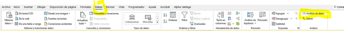 Para esta forma necesitamos hacer uso de la herramienta de ‘Análisis de Datos’ en excel, la cual podemos encontrar en la parte de datos.