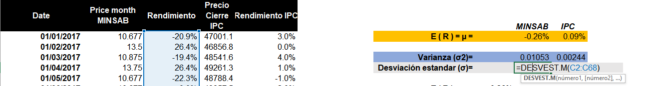 Lo primero es calcular la desviación estándar de los rendimientos tanto de el activo financiero como del índice de referencia, mediante le formula ‘=Desvest.M’